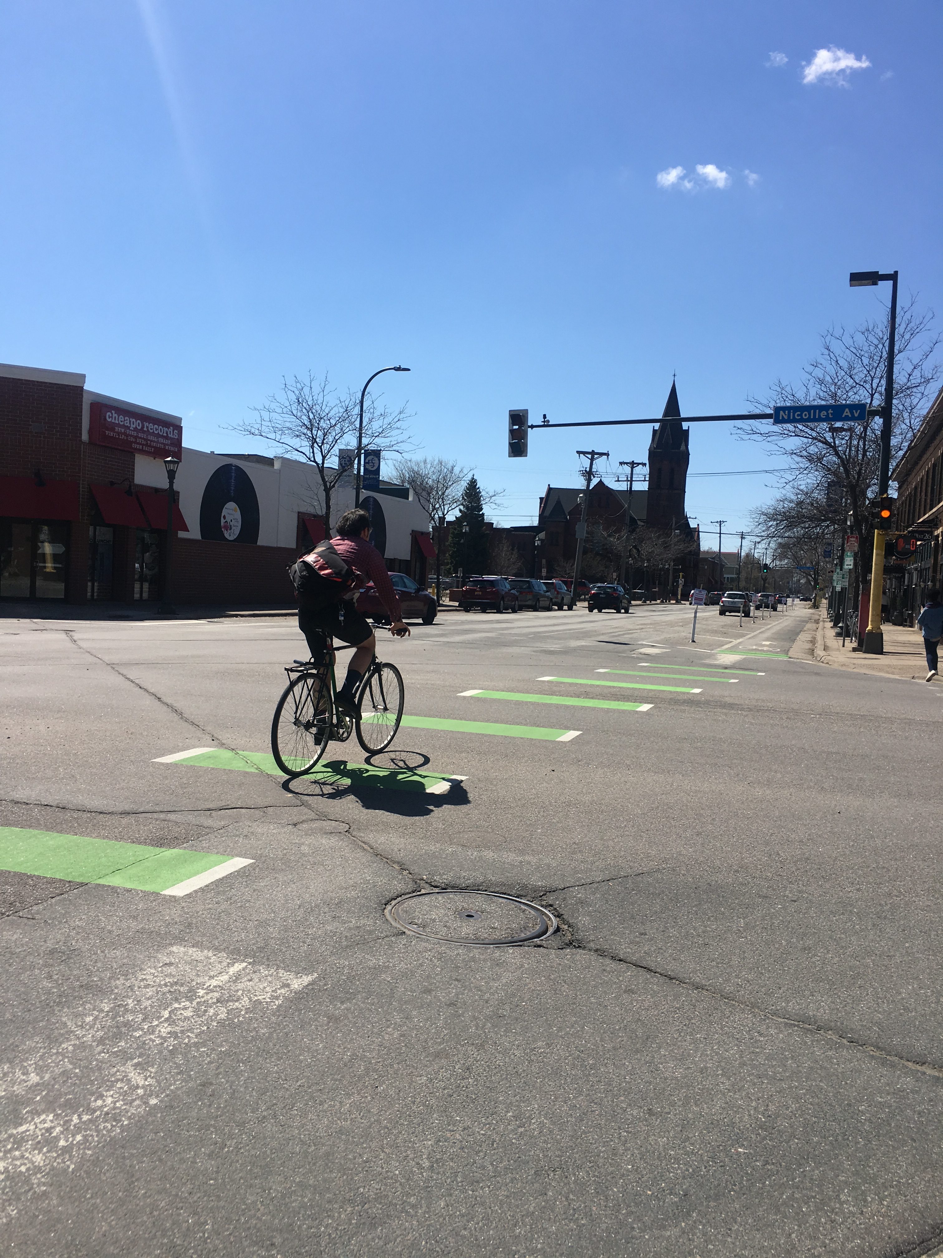 Throughout Minneapolis bicycle paths can be seen but many are not protected. Minneapolis boasts a total of over 200 miles of bike trails, over half of which are on-street bikeways and less than half are off-street bikeways. The off-street paths are often built adjacently or close to parks and lakes, making them very scenic. Some are repurposed land. The Greenway, an almost 9 meter long bike and walking path, was inaugurated in 2000 along a former railroad corridor in the south of the city. This pathway is plowed to be accessible during the winter, is open 24 hours a day, and it lit for safe passage at night. Minneapolis is a city built around many lakes, almost all of which are connected by the Chain of Lakes, a path encircling five of the largest lakes in a 24-km route. There are East and West River Parkways, stretching along the Mississippi River (which begins in Minnesota), and along other parks within the Twin Cities. The topography of the region, mainly flat, helps in creating easy paths but the city’s dedication to maintaining these paths is impressive and explains why there is such a high cycling usage. Minneapolis also has a NiceRide, a bike sharing program with over 3,000 bikes available, and a new mobile application that just allowed for dockless bike sharing.
