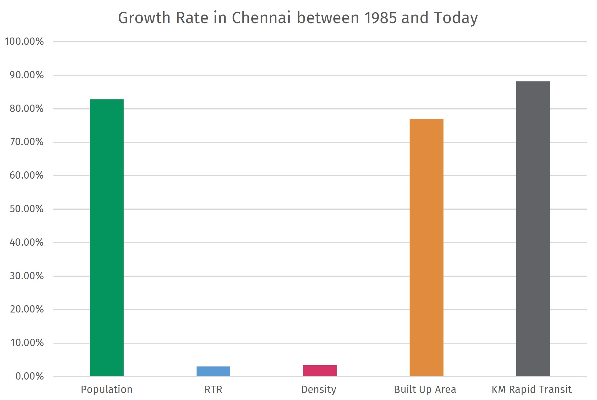 To measure and study cities’ growth objectively, metrics were employed looking at population, density, transit. Kilometers of rapid transit is defined as rapid transit that meets the definition of BRT basics in the BRT Standard, in Chennai kilometers of rapid transit grew from 54.1 in 1985 to 101.8 in 2018. While the kilometers doubled, so too did the population and built up area, meaning that service remained relatively the same. To study how a population is served by rapid transit, the Rapid Transit to Resident Ratio (RTR) compares the population with the length of rapid transit lines – this number shows how well a population is served by rapid transit. Unfortunately for Chennai residents, RTR has remained relatively unchanged in the past 35 years.