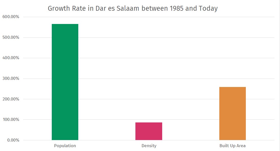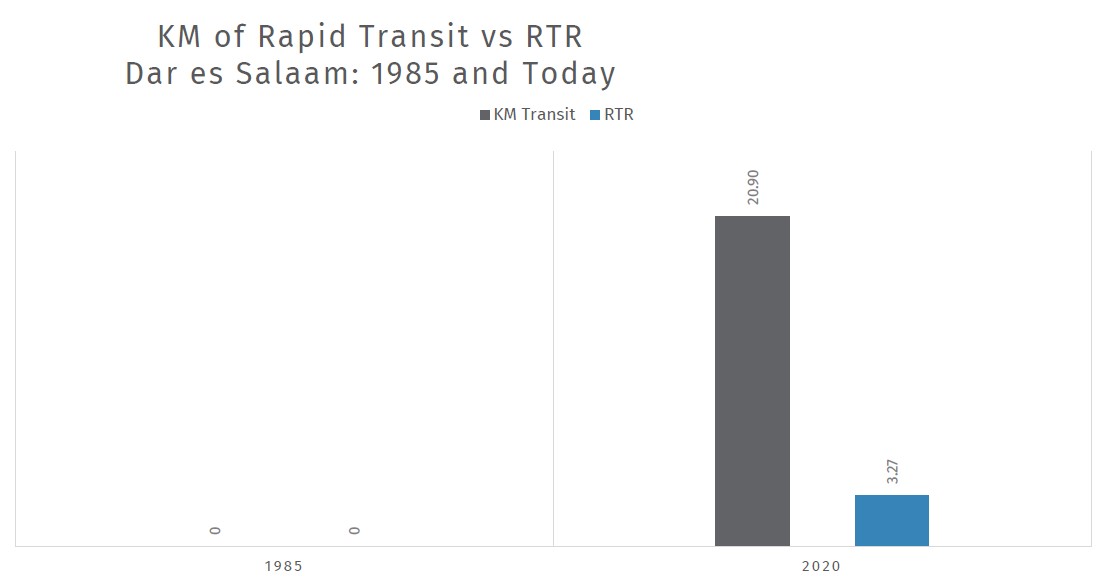 To measure and study cities’ growth objectively, metrics were employed looking at population, density, and transit. In these figures, kilometers of rapid transit are defined as rapid transit that meets the definition of BRT basics in the BRT Standard, in Dar es Salaam kilometers of rapid transit grew from 0 in 1985 to 20.9 in 2018, which was made up entirely of the BRT, DART. While this demonstrates important growth, there is still much more progress to be made. One statistic included in these graphs is the Rapid Transit to Resident Ratio (RTR) which compares the population with the length of rapid transit lines – this number shows how well a population is served by rapid transit. While RTR can now be measured in Dar es Salaam, at 3.27, there is obviously much progress to be made. The most precipitous growth in Dar es Salaam in the past 35 years has been the explosion of population. Dar es Salaam went from home to fewer than 1 million people to home for over six million people and is the second fastest growing city in the world. With such fast population growth, it will be important for Dar es Salaam to avoid tired, and dysfunctional models of growth centered around car usage and instead build for sustainability.