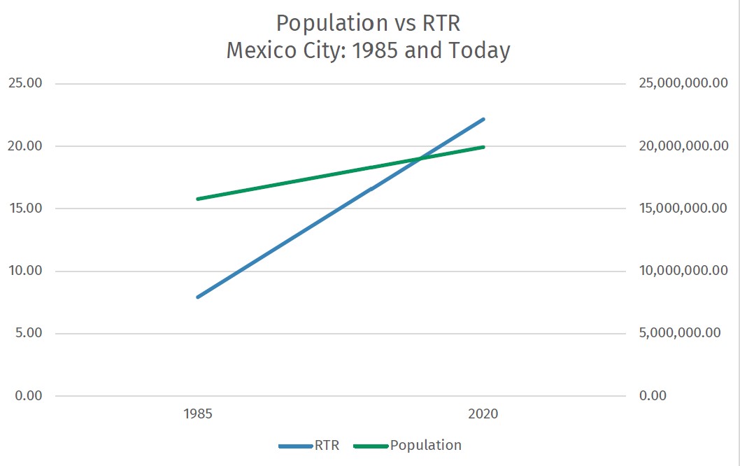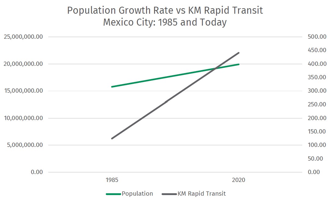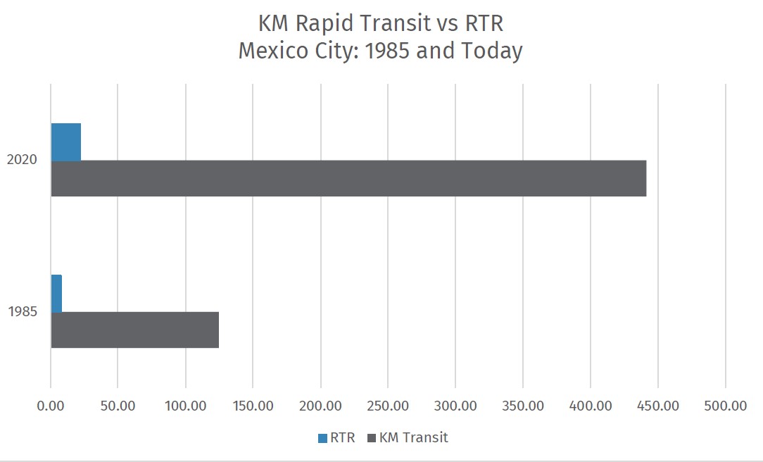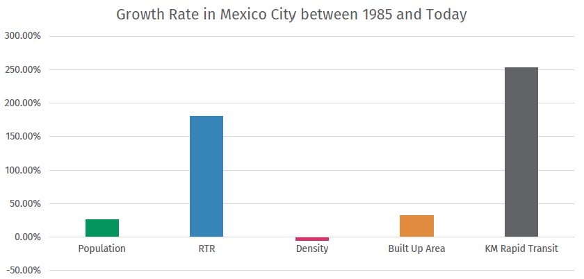 To measure and study cities’ growth objectively, metrics were employed looking at population, density, and transit. In these figures, kilometers of rapid transit are defined as rapid transit that meets the definition of BRT basics in the BRT Standard, in Mexico City kilometers of rapid transit grew by over 200% from 124.7 kilometers of rapid transit to 441.2 kilometers of rapid transit. This growth helped increase the RTR from 7.91 to 22.15. Rapid Transit to Resident Ratio (RTR) is a very useful metric that compares the population with the length of rapid transit lines – this number shows how well a population is served by rapid transit. Mexico City has a very strong RTR compared to a global average of 11.3. One of the major challenges plaguing Mexico City, however, is sprawl. Within the city center, transit remains strong but less so for the surrounding residential areas, which are sprawling.