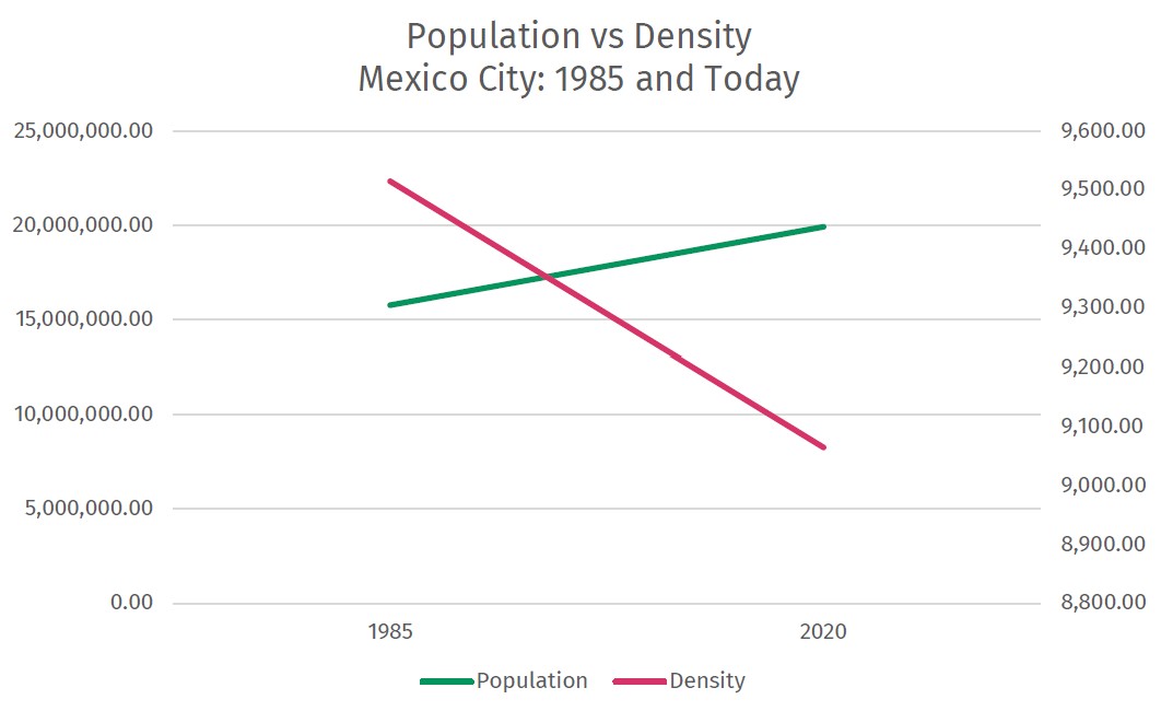 35 years ago, Mexico City was devastated by an 8.1 magnitude earthquake. The 1985 quake killed as many as 30,000 people, damaged 31 percent of the city’s buildings, and razed the homes of up to 700,000 people. Today, Mexico City is one of the most important economic hubs in the region, straddling both North and Latin America, and has grown from a population of 15 million to 20 million. This growth, anticipated to be even faster in the next decade, has drawn focus to the difficult topography of the city, built in a valley which was once an ancient lakebed. Combine this with a car-oriented sprawl of 20 million people, and the unpleasant outcome of pollution, air quality, and massive traffic congestion results.