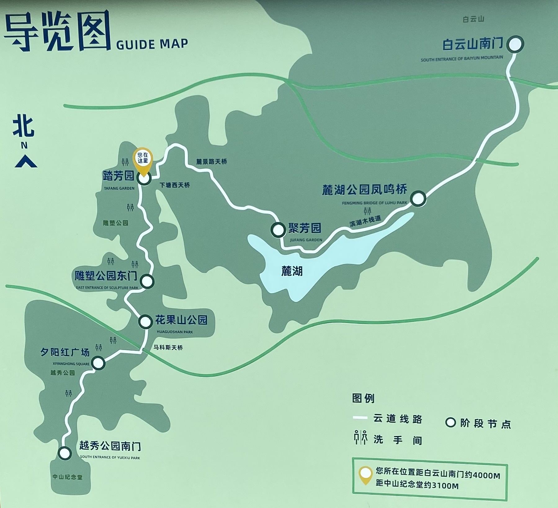 A beautiful panorama of Guangzhou can be witnessed from atop the centrally located Baiyun (‘white cloud’) Mountain. Now, a new pedestrian walkway connects the mountain to the historic city center at Sun Yat-sen Memorial Hall. The Cloud Pathway was constructed in six months and links up some of Guangzhou’s most iconic sights, like Yuexiu Park, Huaguoshan Park, Sculpture Park, Luhu Lake Park, and Yuntai Flower Park. The trail, three to five meters wide at different parts, follows existing pathways through parks, combined with newly-built elevated skywalks. The pathway is fully continuous. Along the route, trees, plants and flowers have been planted, and toilets, maps, trash bins and vending machines have been constructed. Ramps for wheelchairs and strollers are available at inclines, and CCTV cameras operate for public safety. The Pathway can be accessed by bus, metro, and cycle. There are two metro lines that connect to the trail as well as numerous bus routes. Bike share stations are plentiful, but cycling is not permitted along the trail. The Cloud Pathway offers a pleasant and interesting walk with some spectacular views. Besides a leisure function, the pathway also benefits local residents living nearby, through shorter and safer connections to their destinations.