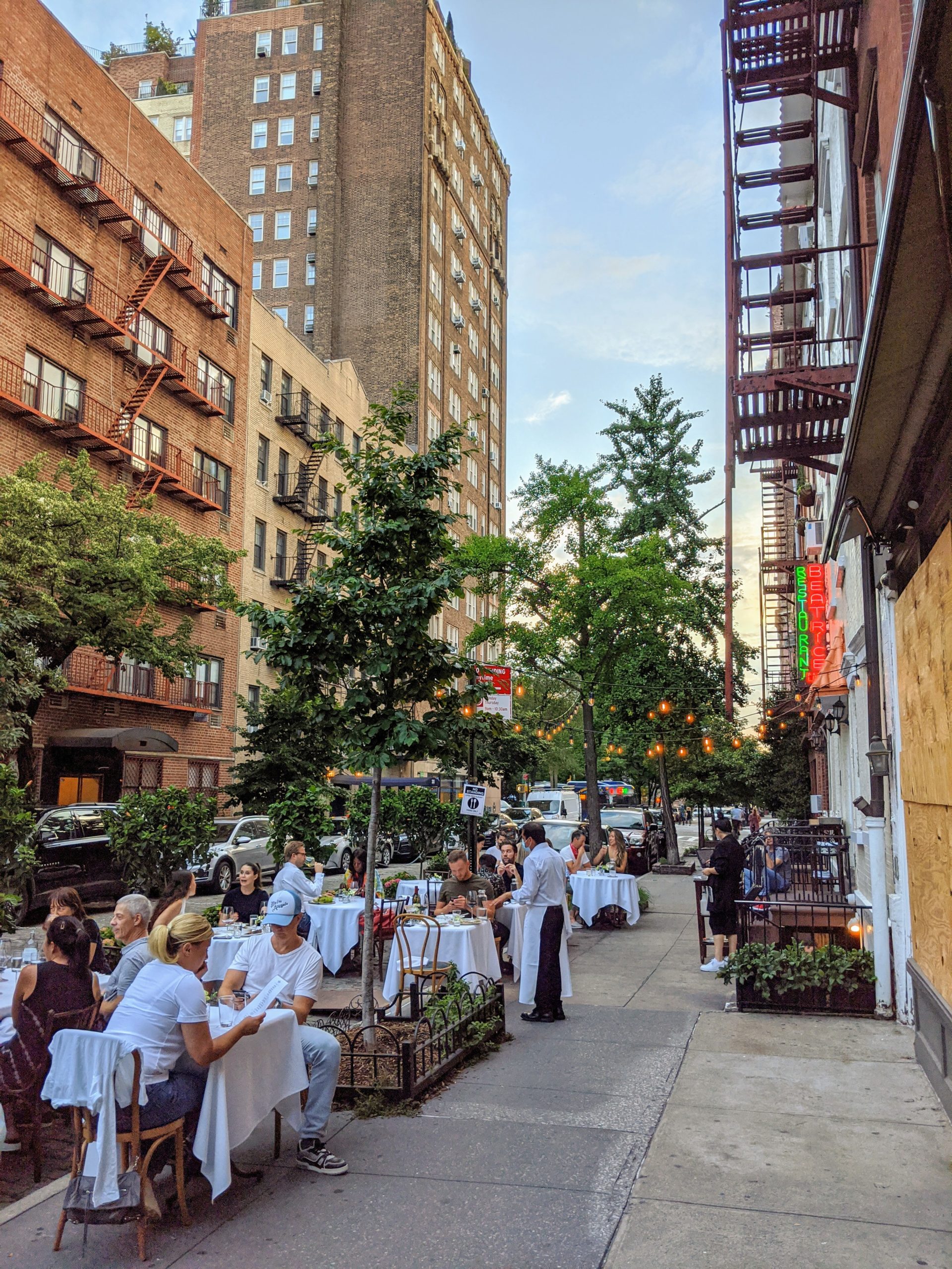 A New York City restaurant with outdoor dining that has taken over some street parking. Still, patrons are sitting next to passing traffic as the street is not entirely shut down.