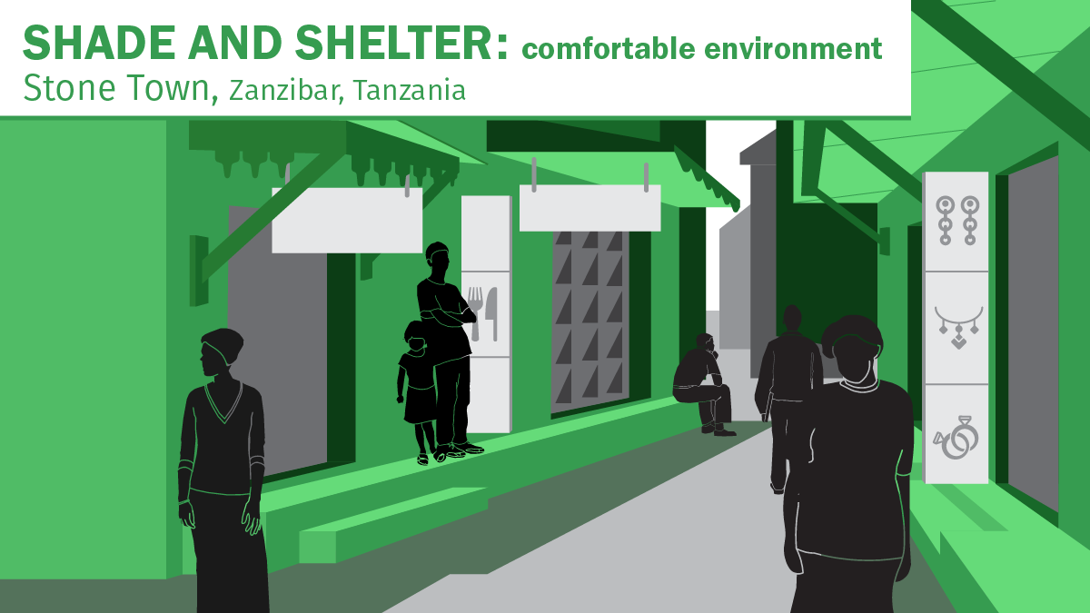 Above left: In Nairobi, Kenya expanded sidewalks and a bustling commercial fronts create a lively walking environment. Above right: In Guangzhou, China, a fully pedestrianized space that includes shade from trees and well maintained foliage along a commercial street gives residents reasons to stroll and linger.