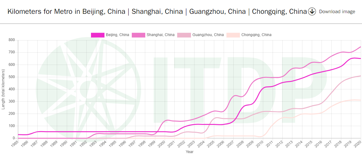 ITDP has been at the forefront of public transportation for over thirty years; having always understood that public transportation is an integral part of a well-planned, safe, and accessible city. It is in this vein that ITDP has created the world’s first, publicly available Rapid Transit Database. This database, now available in interactive format, tracks rapid transit corridors from cities around the world and updates them annually. The online tool allows users to compare up to four locations and provides graphed data dating back to 1985. One important feature of the tool is the inclusion of Rapid Transit to Resident Ratio (RTR). This metric is entirely ITDP developed and measures a rapid transit system by comparing it to the population it serves. This ratio shows how prevalent a transit system is based on the population it is meant to serve. For example, in small city, fewer than 50 kilometers of rapid transit could have a high RTR because its small population is well served, whereas a large city might have hundreds of kilometers of rapid transit but might have a low RTR because its population is so large and vast. RTR provides a lens into the utility and usefulness of a rapid transit system.