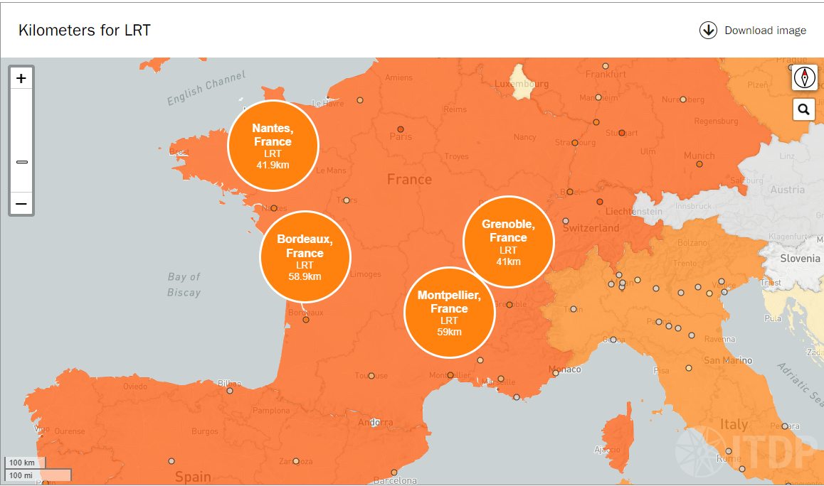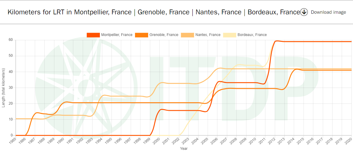 There are some trends that can be observed in the past ten years. Light rail, or LRT, has seen gains worldwide. Light rail functions similar to BRT in that it is an above ground vehicle, but rather than being on a road, LRT vehicles are connected to a fixed track. France has invested significantly in light-rail. Now home to over 750 kilometers of trams, France has nearly doubled its LRT in the past ten years, often in its southern and western cities.