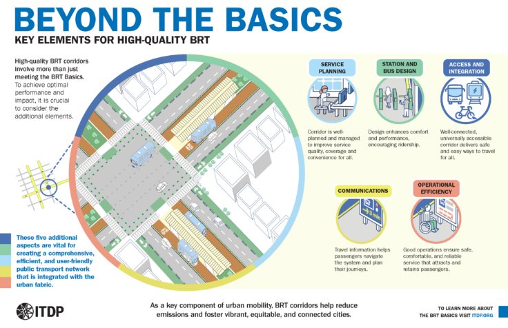 BRT systems offer similar gains in efficiency and cost-effectiveness compared to other rapid transit systems like metro and light rail. BRT is also highly adaptable and can be designed to fit a city’s specific needs and constraints, whether accommodating existing road layouts, varying demand levels, or integrating with other transportation systems. BRT corridors offer many benefits for urban mobility, especially as cities face a growing challenge of providing affordable, sustainable, and inclusive access to jobs, education, housing, and public services.
