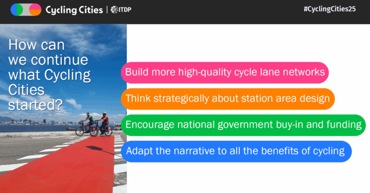 While the progress amongst our partners has been remarkable in just four years, there is still more to be done, and this work cannot slow down with the close of Cycling Cities as a campaign. The campaign first set an ambitious goal of having 25 million more people near safe cycle lanes by 2030, and we still believe that, as a network, the cohort can achieve this. We hope that the number of cities and countries that share this vision will continue to grow as well.