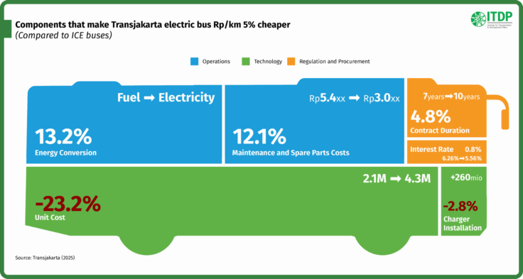 Such feeder lines are crucial to enhancing overall public transport ridership and usage. Increasing electric bus fleets to improve public transport service quality and accessibility is certainly feasible for cities across Indonesia. Although the upfront investment in the transition may be high, the reduced operational and maintenance costs of e-buses are much lower than those of conventional fuel buses in the long term.