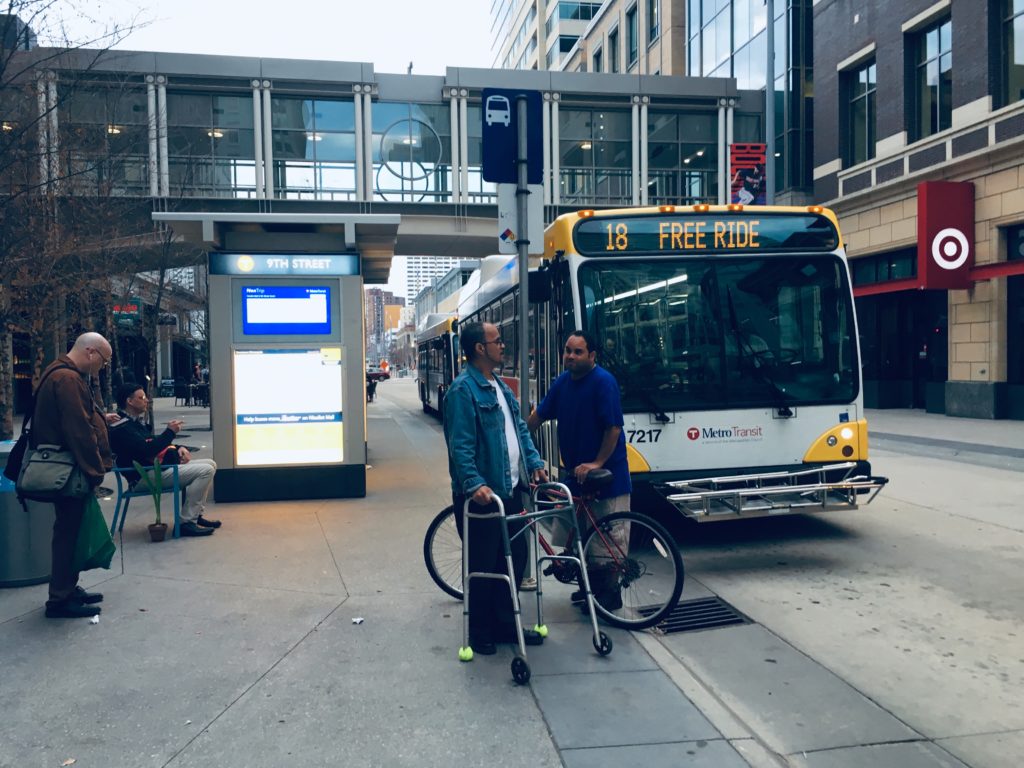One of the most striking parts of Minneapolis is how accessible it is. Each train station in the Light Rail is fully wheelchair accessible with at-street boarding for all cars. Each train car is fitted with spacious areas dedicated for wheelchairs with disabled and elderly seating clearly demarcated and accessible. The bus system in the city is wheelchair accessible and there is a program called Metro Mobility which provides scheduled rides to people with disabilities. Furthermore, in the city of Minneapolis, the sidewalks are fitted with ramped curbs allowing for wheelchair access and each crosswalk includes a wheelchair level button for crossing that also makes a loud noise when crossing, to accommodate the visually impaired.