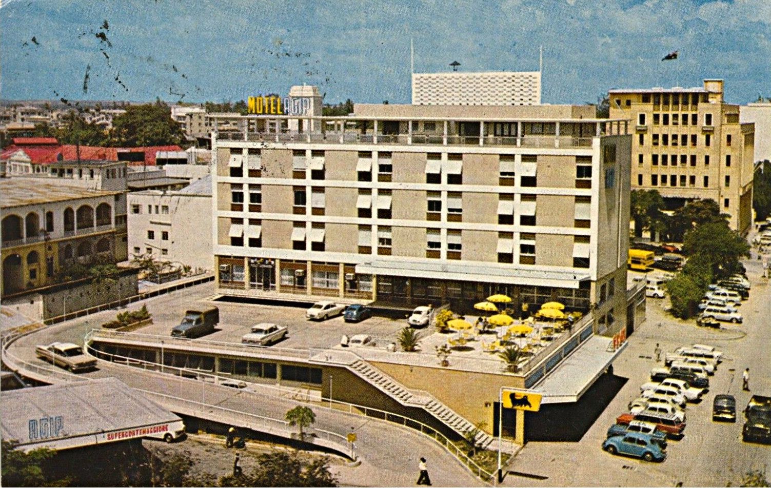 Yellowish building in Dar es Salaam in front of road.